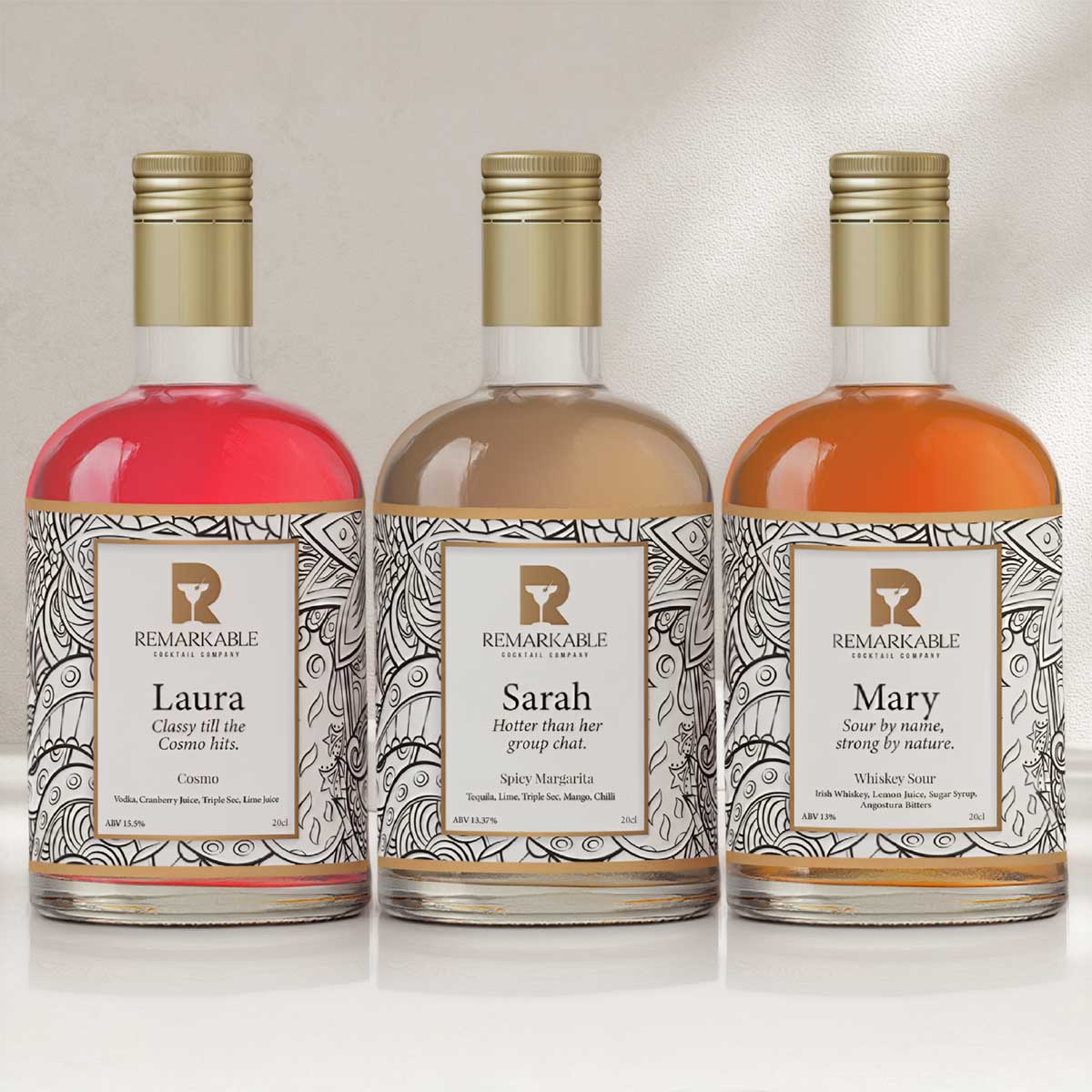 Pick any four cocktails from The Remarkable Cocktail Company range; Espresso Martini, Pornstar Martini, Whiskey Sour, Strawberry Daiquiri, Margarita, Spicy Margarita, Cosmopolitan or Paloma, and make each bottle your own.